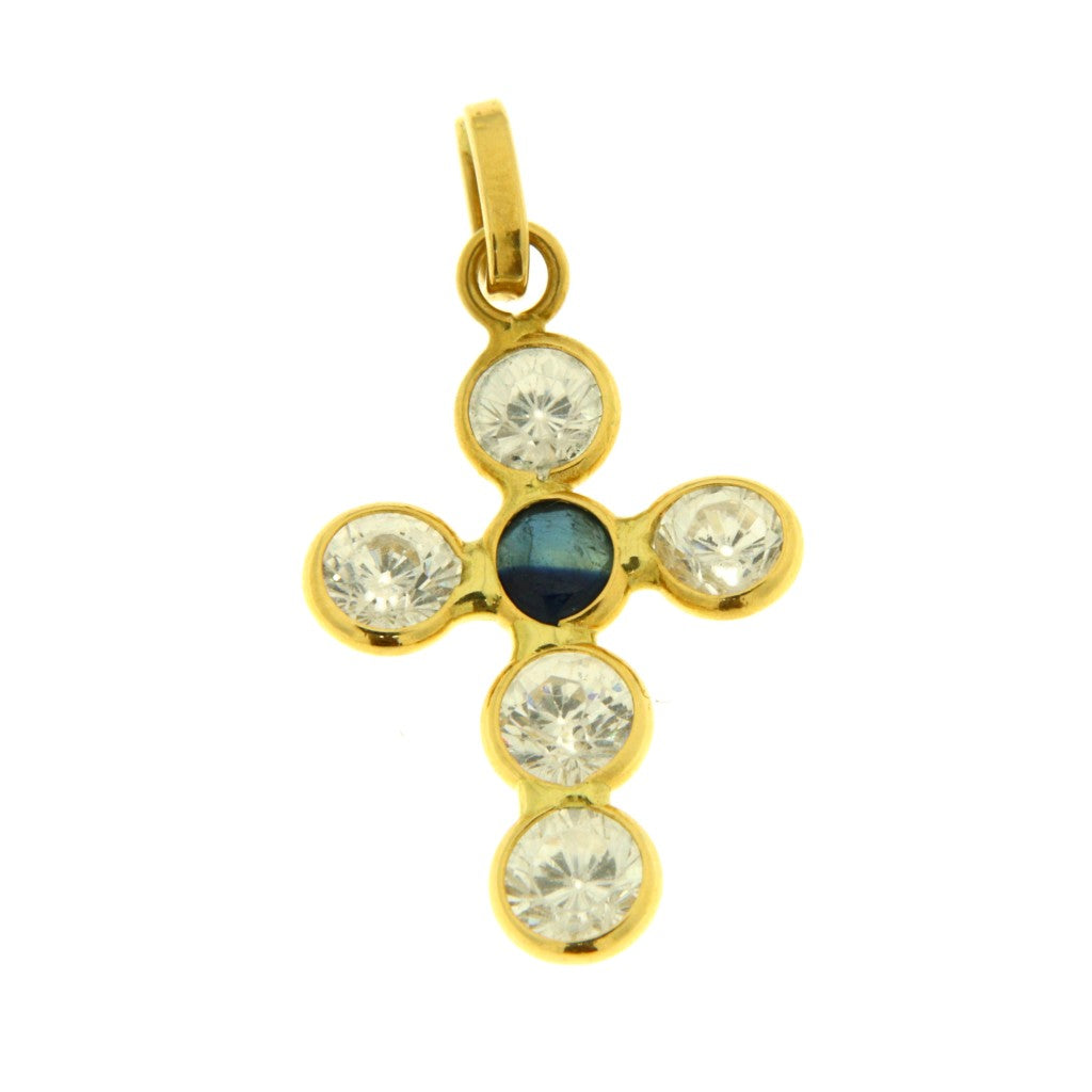 Ciondolo in oro 750 (18KT) Croce con pietre bianche e pietra centrale blu Dimensione/misura cm...