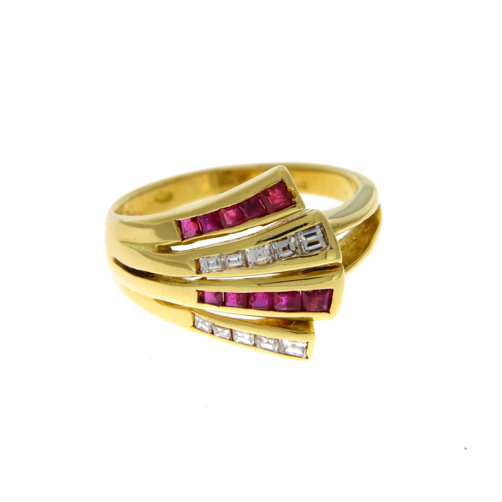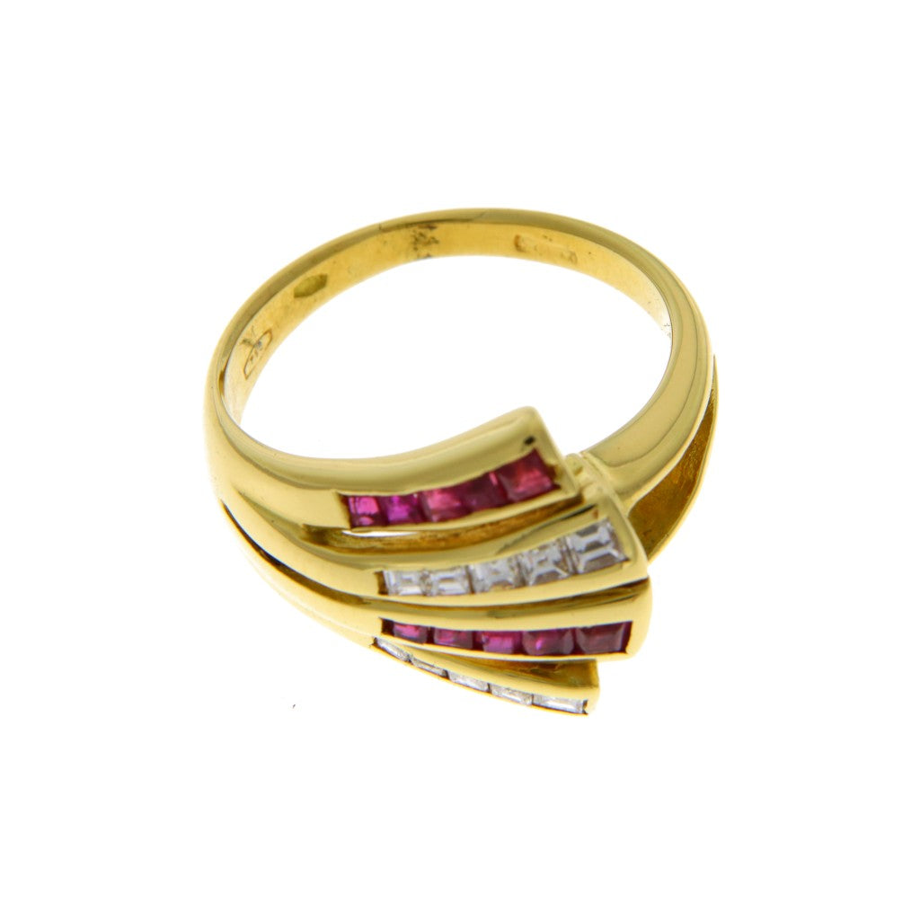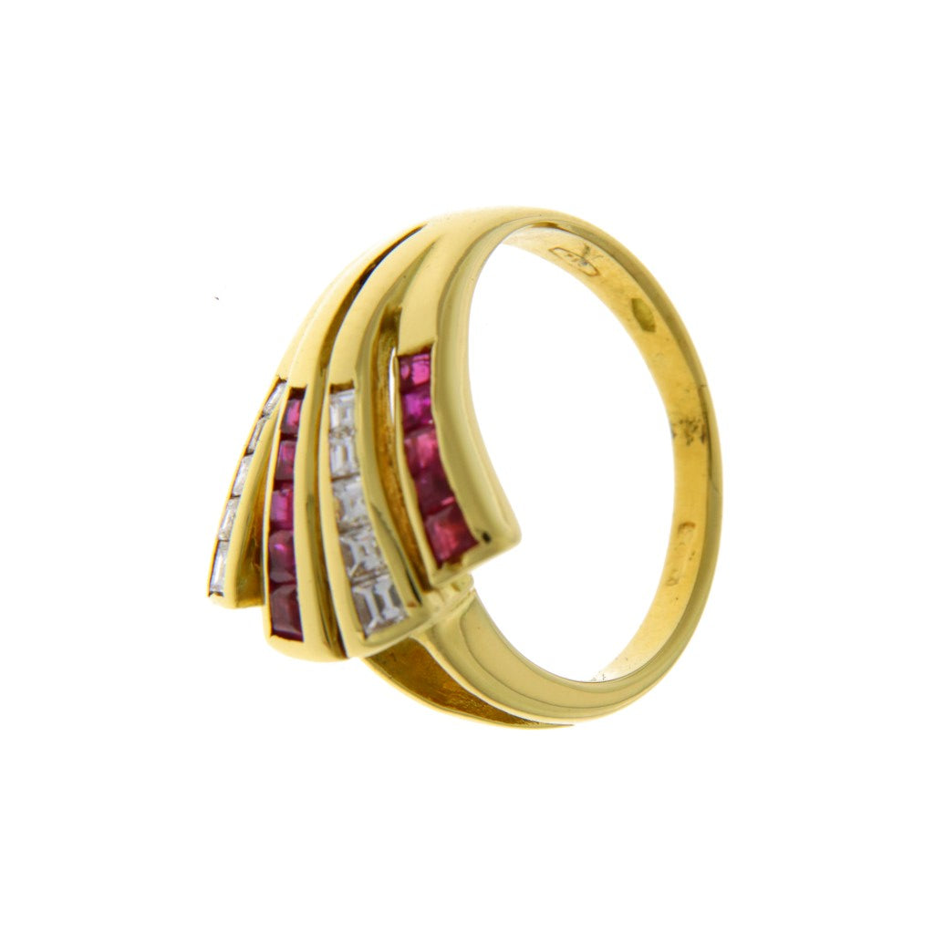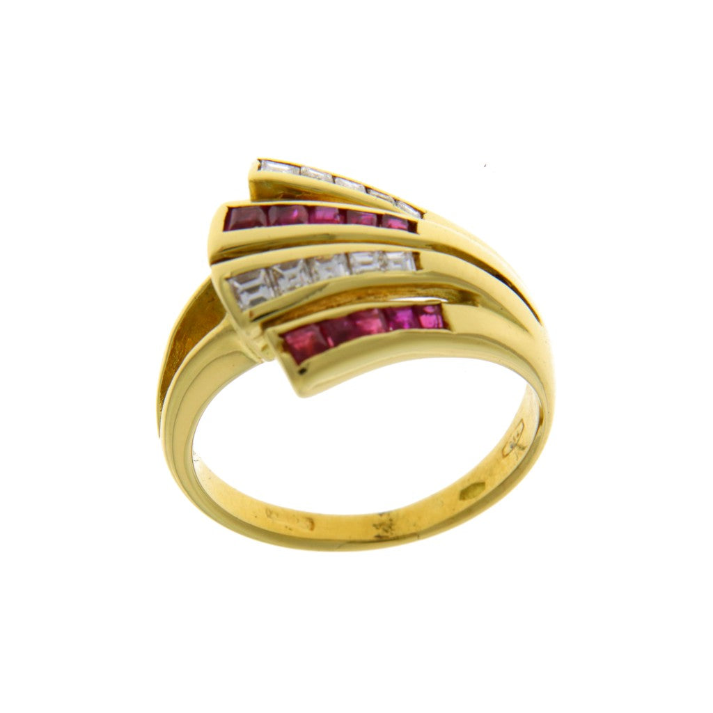 Anello in oro 750 (18 KT) fascia tripla riviera a ventaglio con pietre rosse e bianche