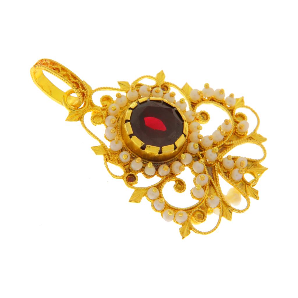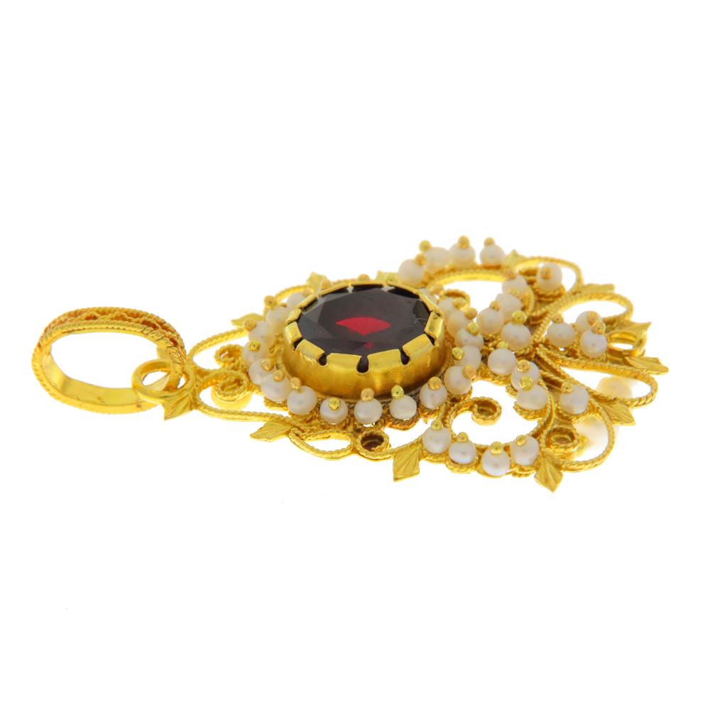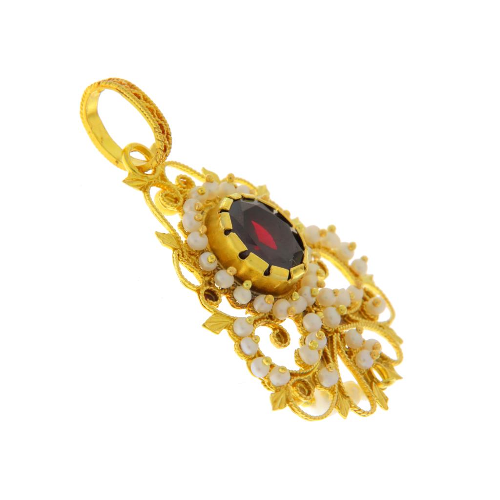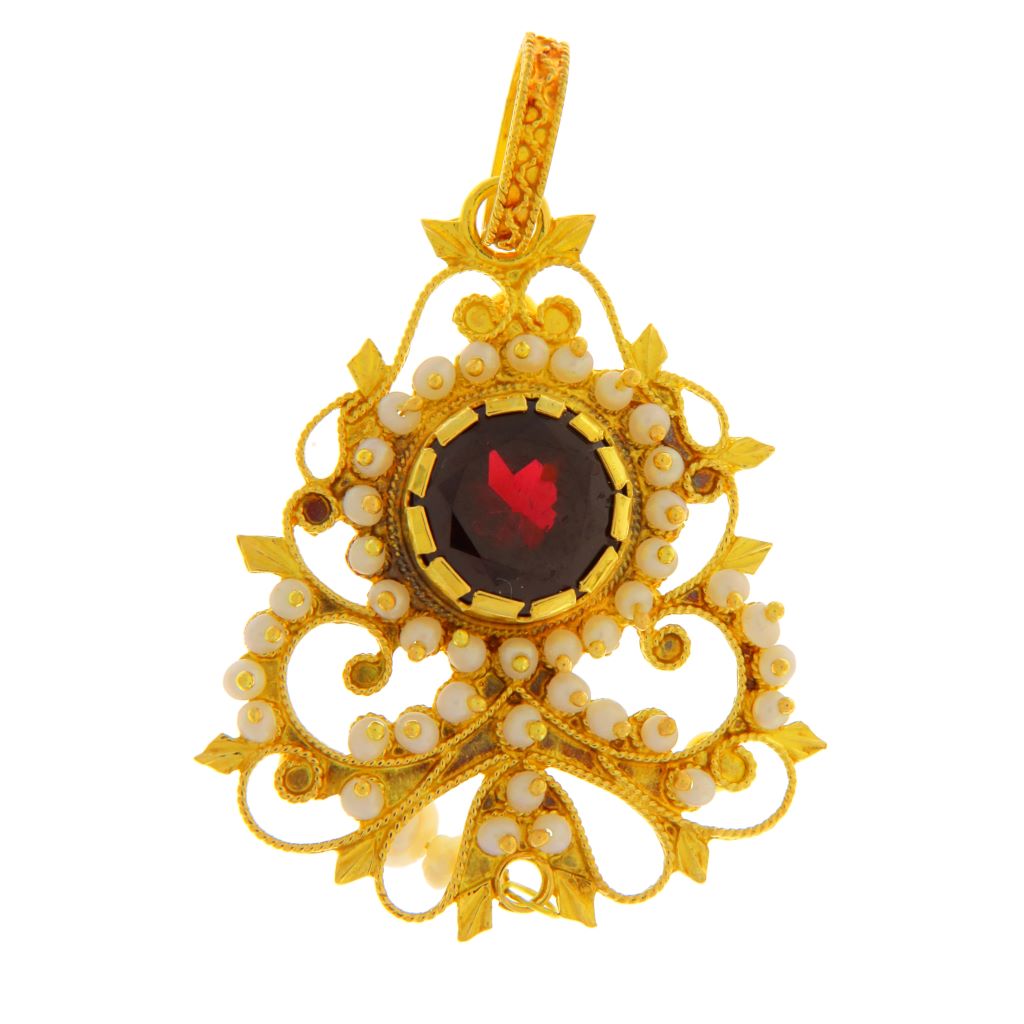Ciondolo in oro giallo 750 (18KT) fantasia con lavorazione in filigrana sarda, scaramazze e granato centrale