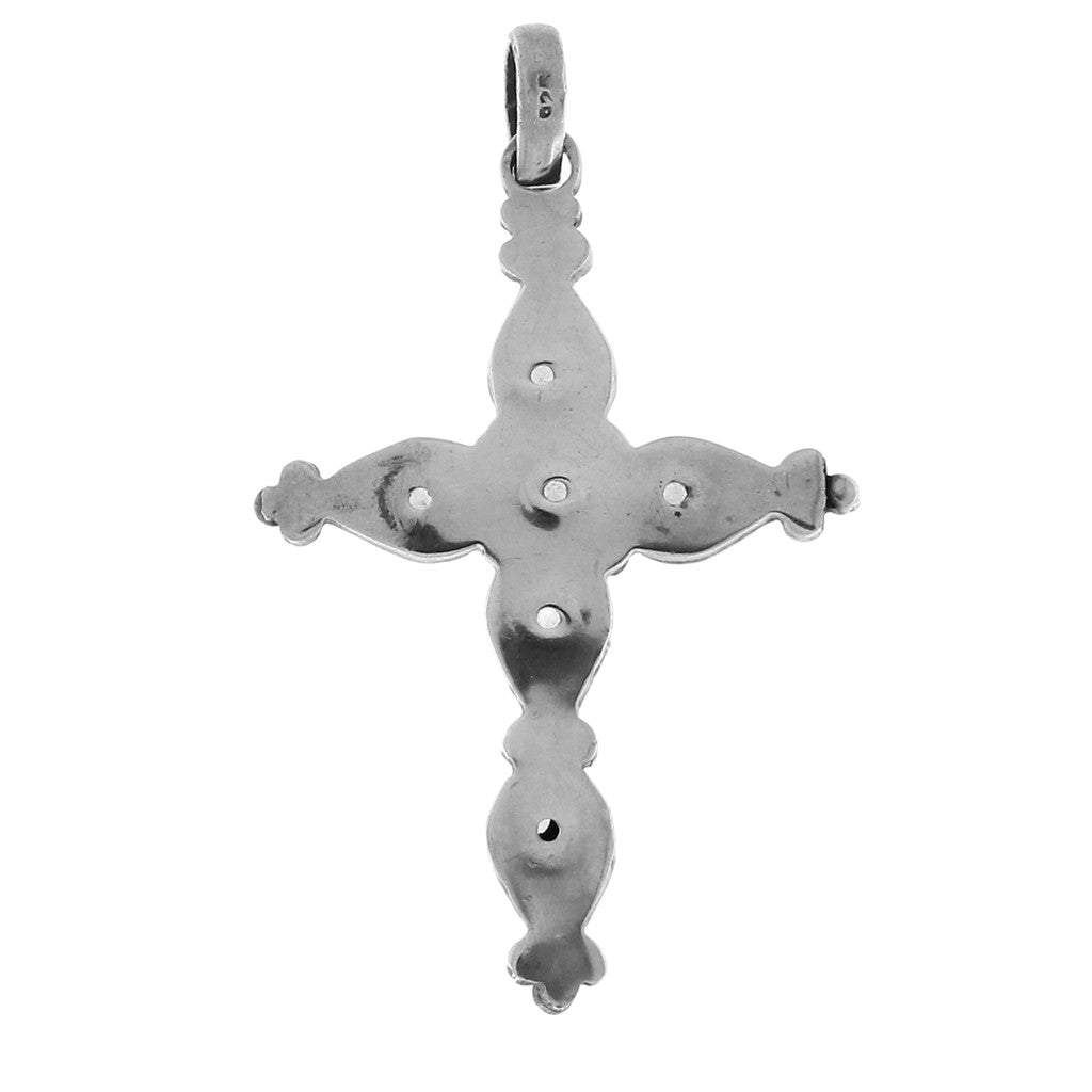 Ciondolo in argento 925 a forma di Croce con possibili pietre di ametista (no certificazione) per la maggiore dal taglio princess. Lavorazione a granulazione (o borchie).