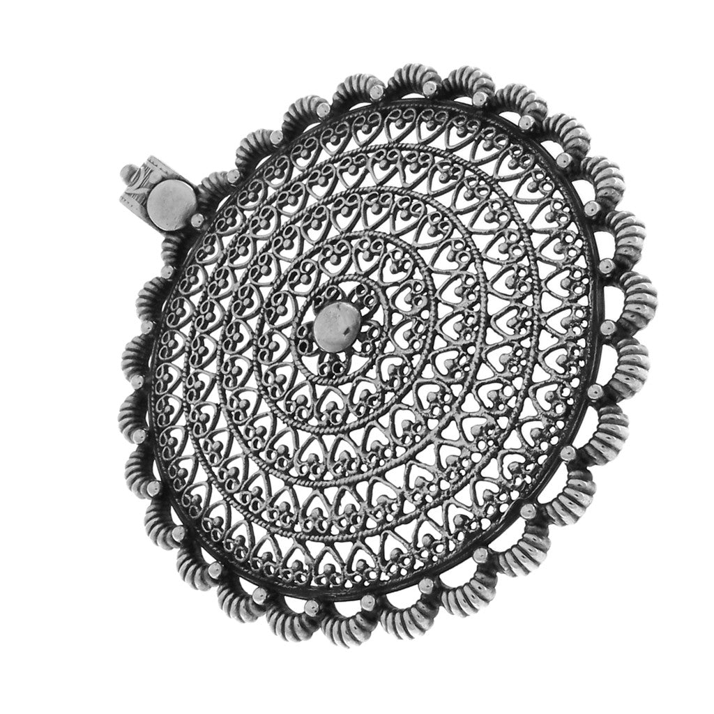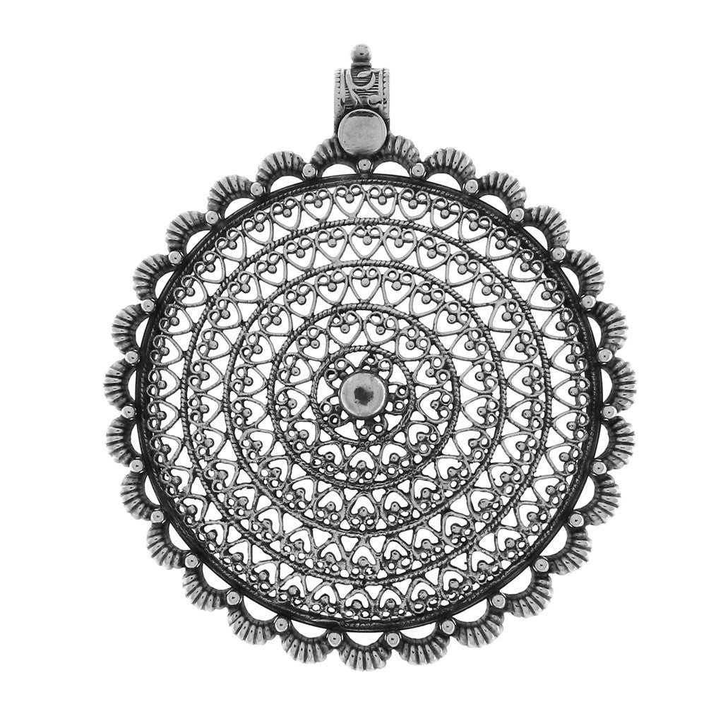 Ciondolo in argento, tondo con lavorazione orlata nei bordi e a cuori nella parte centrale