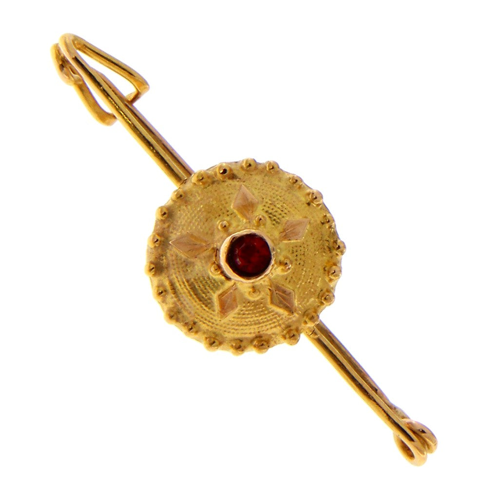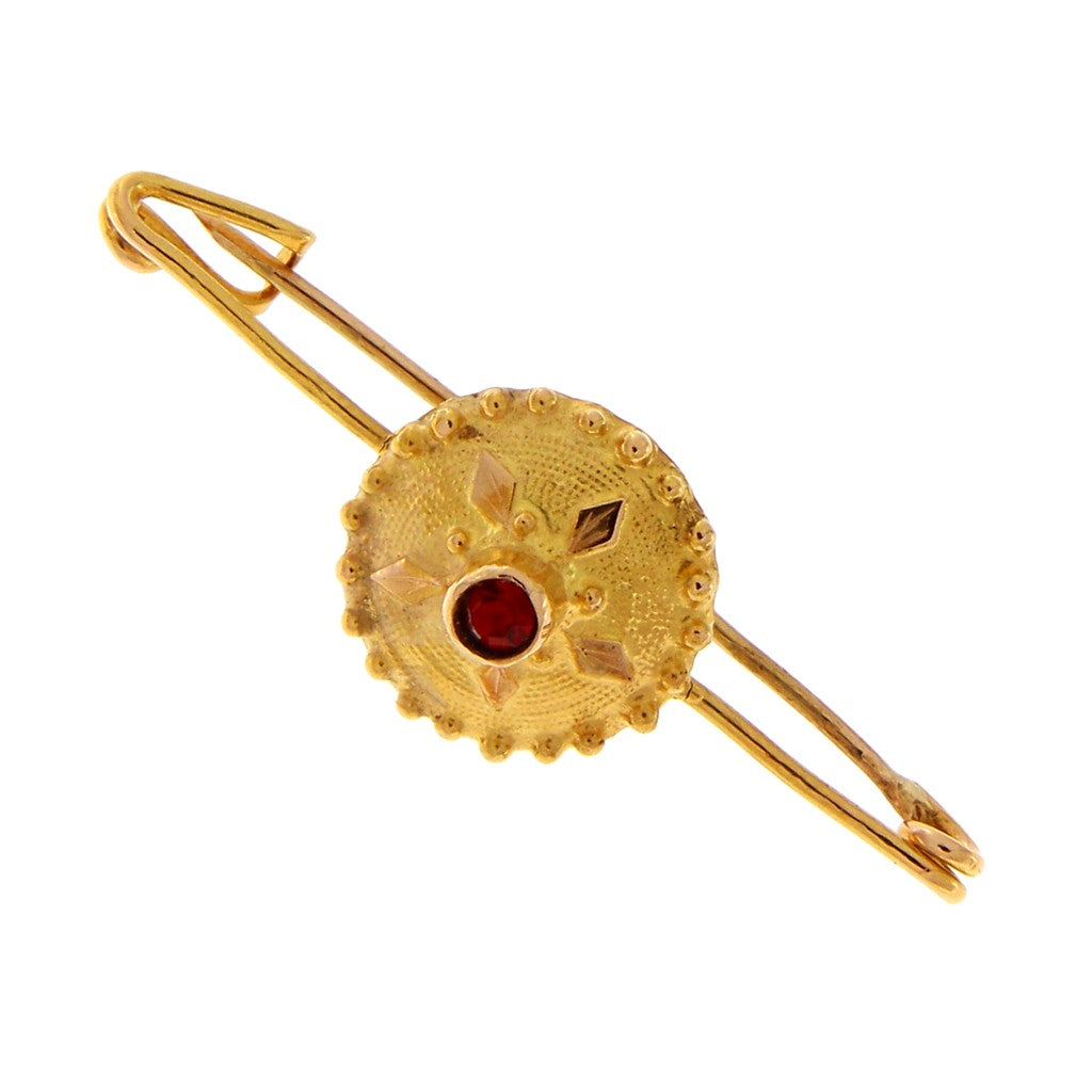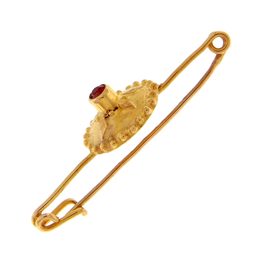 Spilla in oro giallo 750 (18KT) bottone sardo in filigrana con pietrina rossa